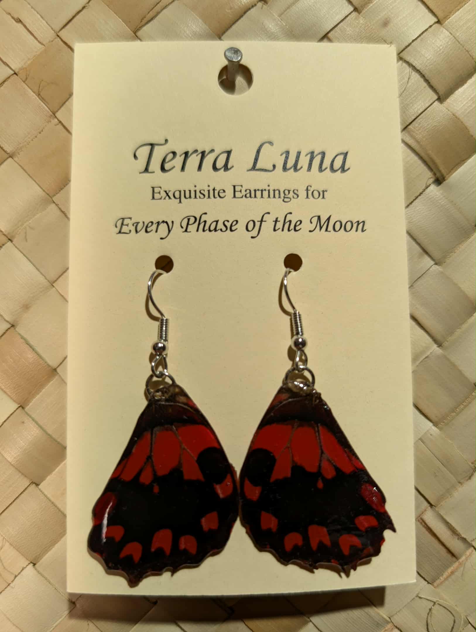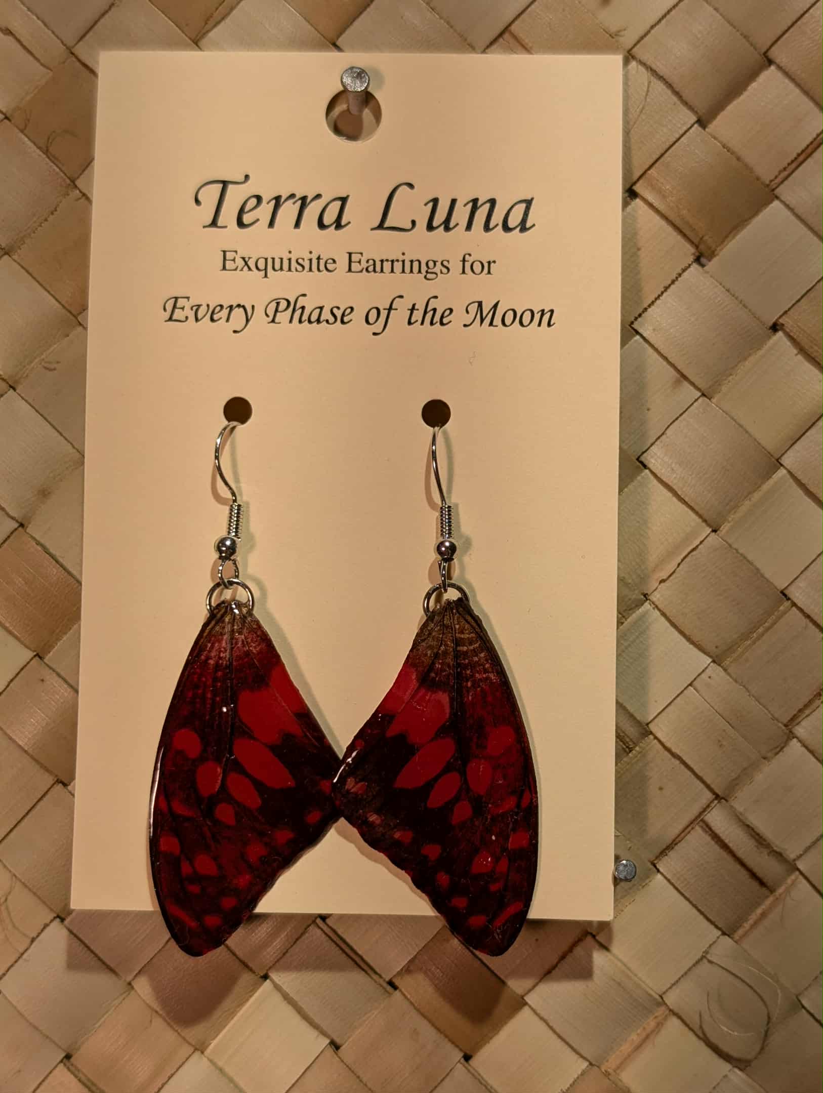 Butterfly wing earrings. They are available in a triangular or rounded shape in the color red. COLORING MAY VARY