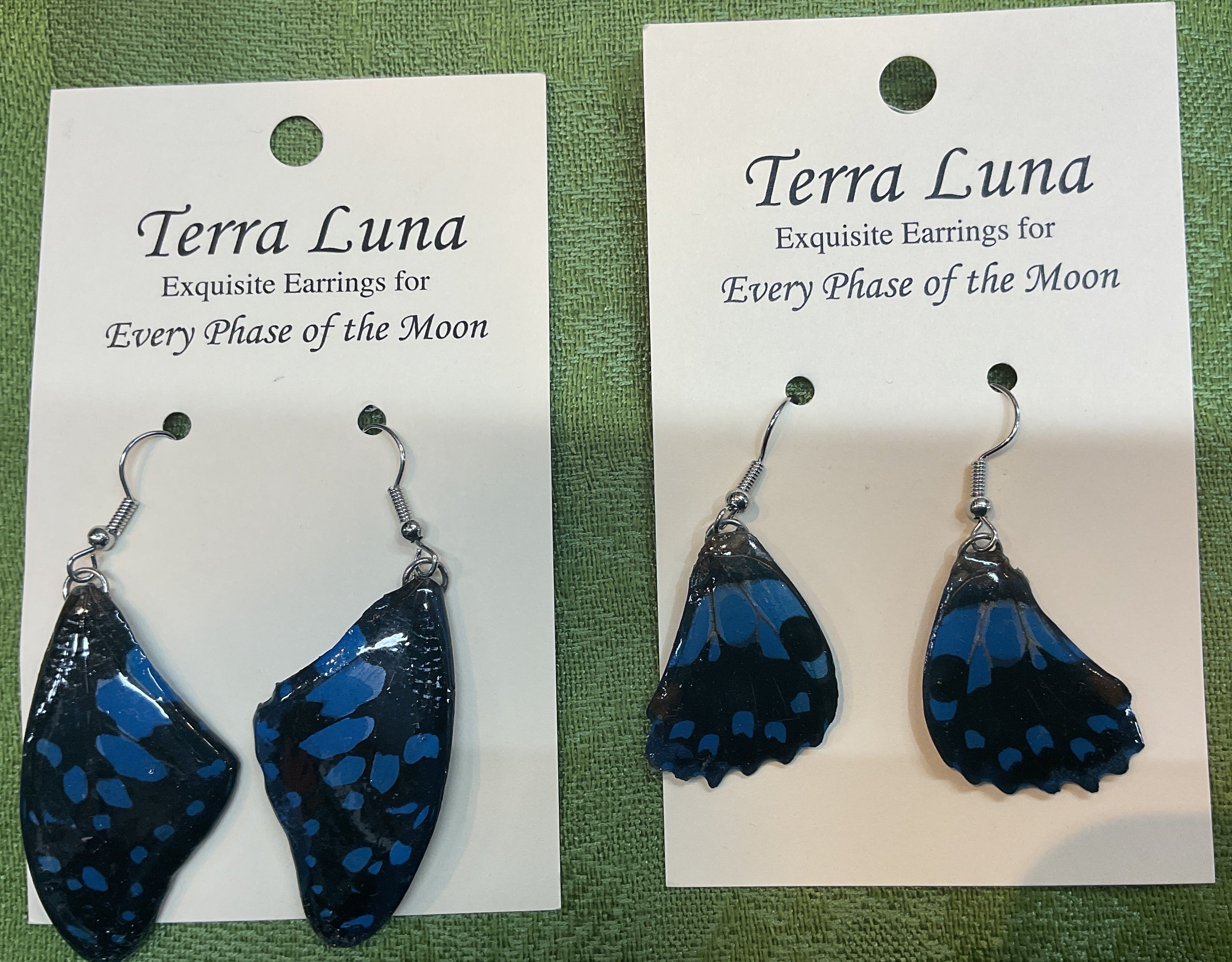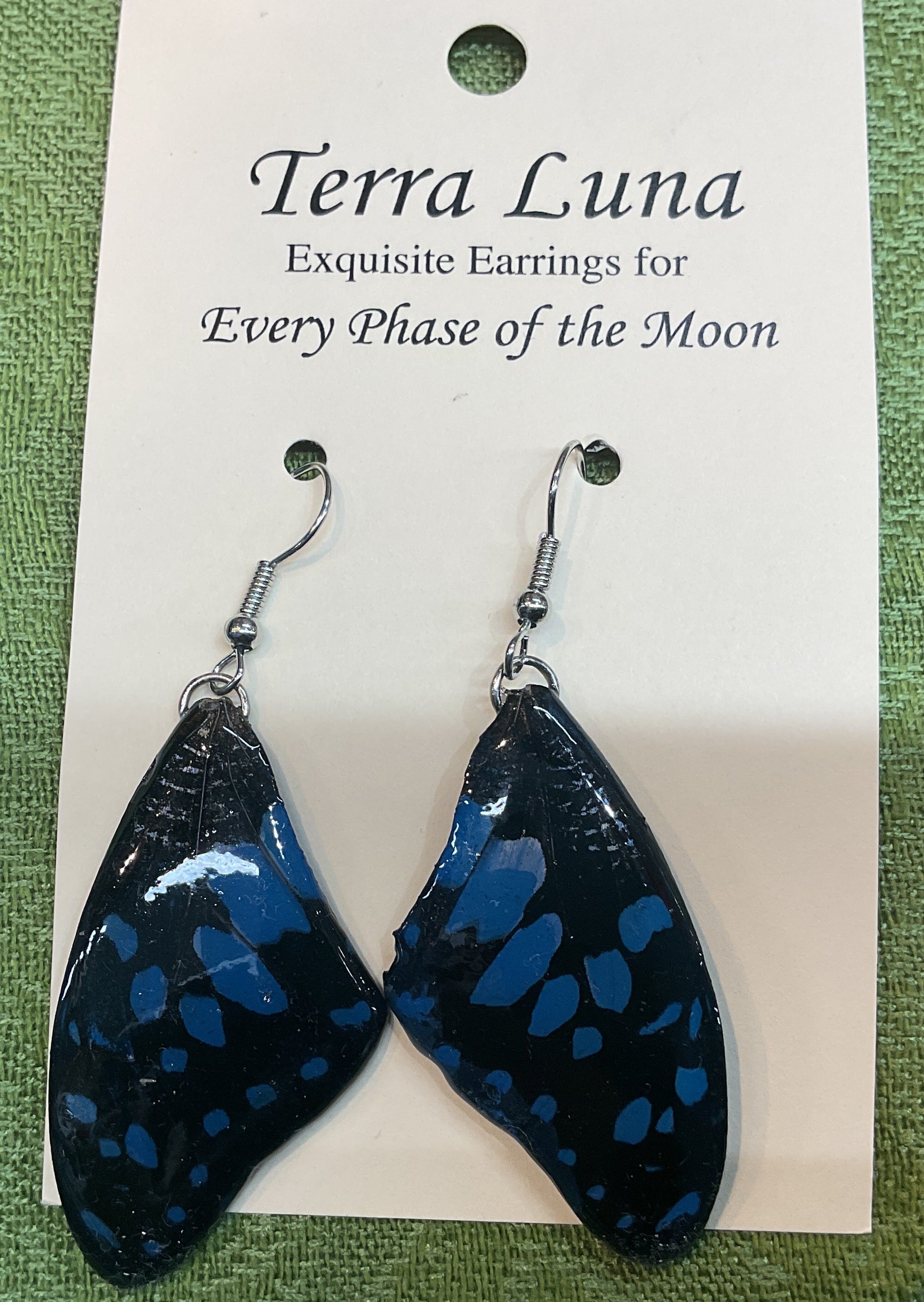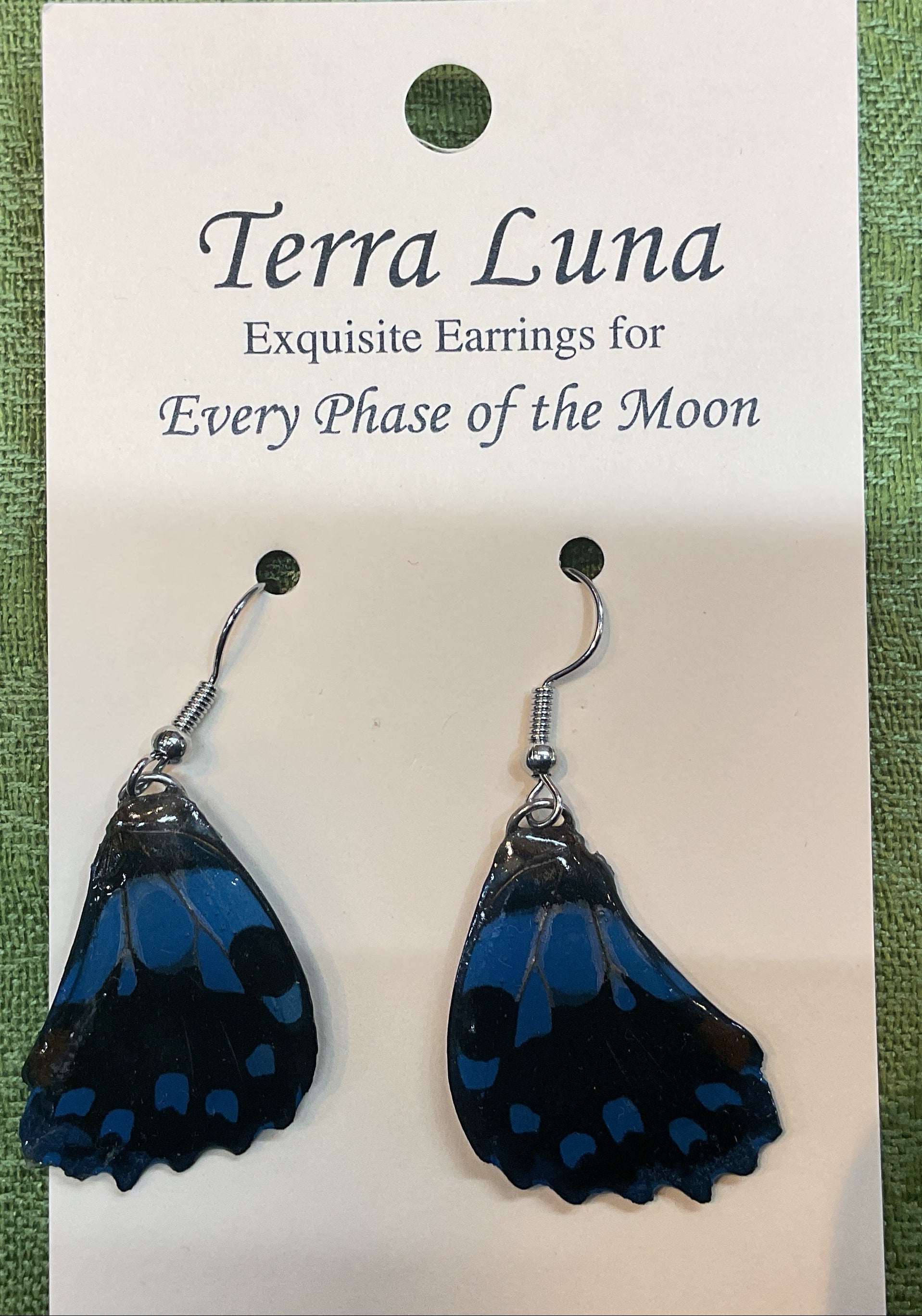 Butterfly wing earrings. They are available in a rounded or triangular shape in the color blue. COLORING MAY VARY
