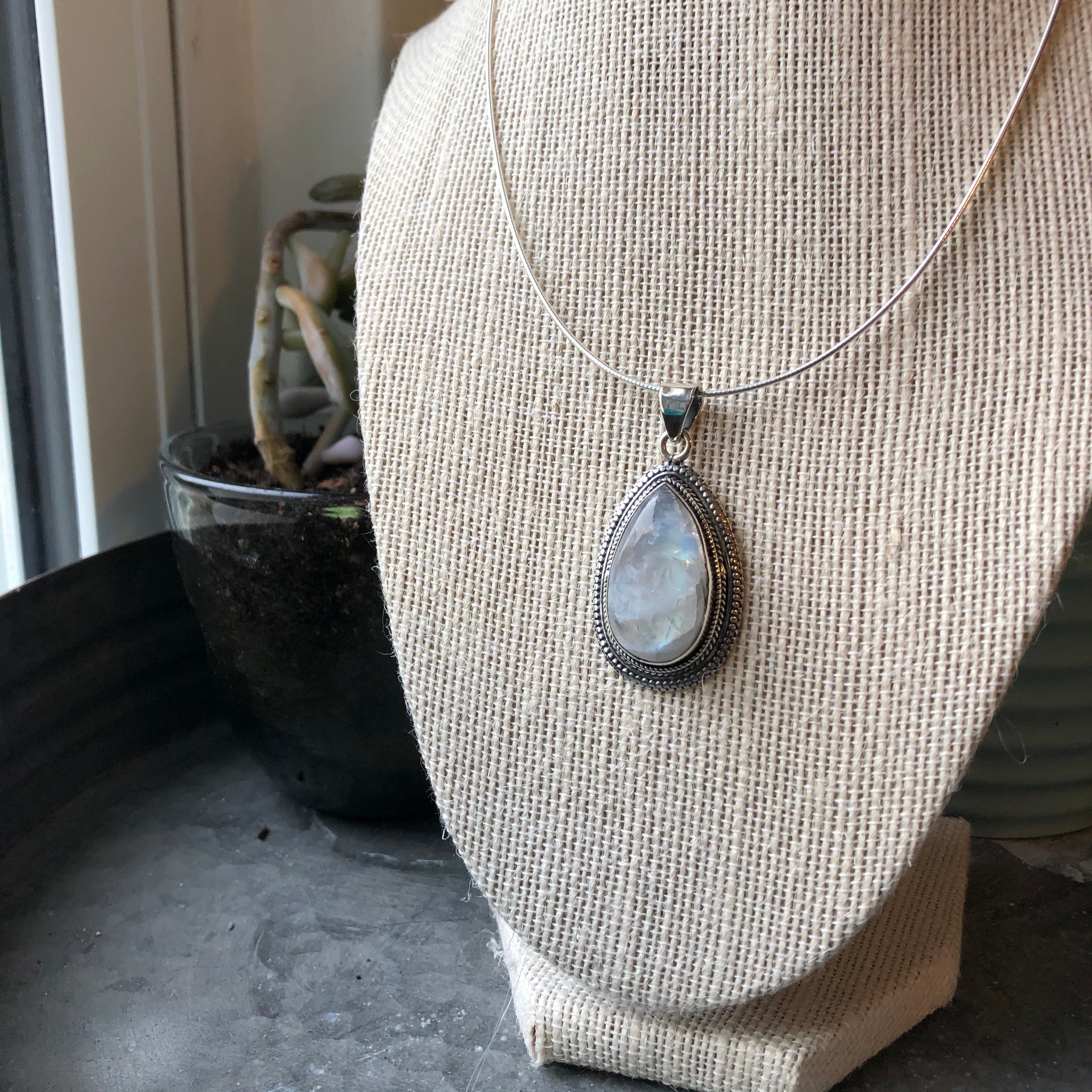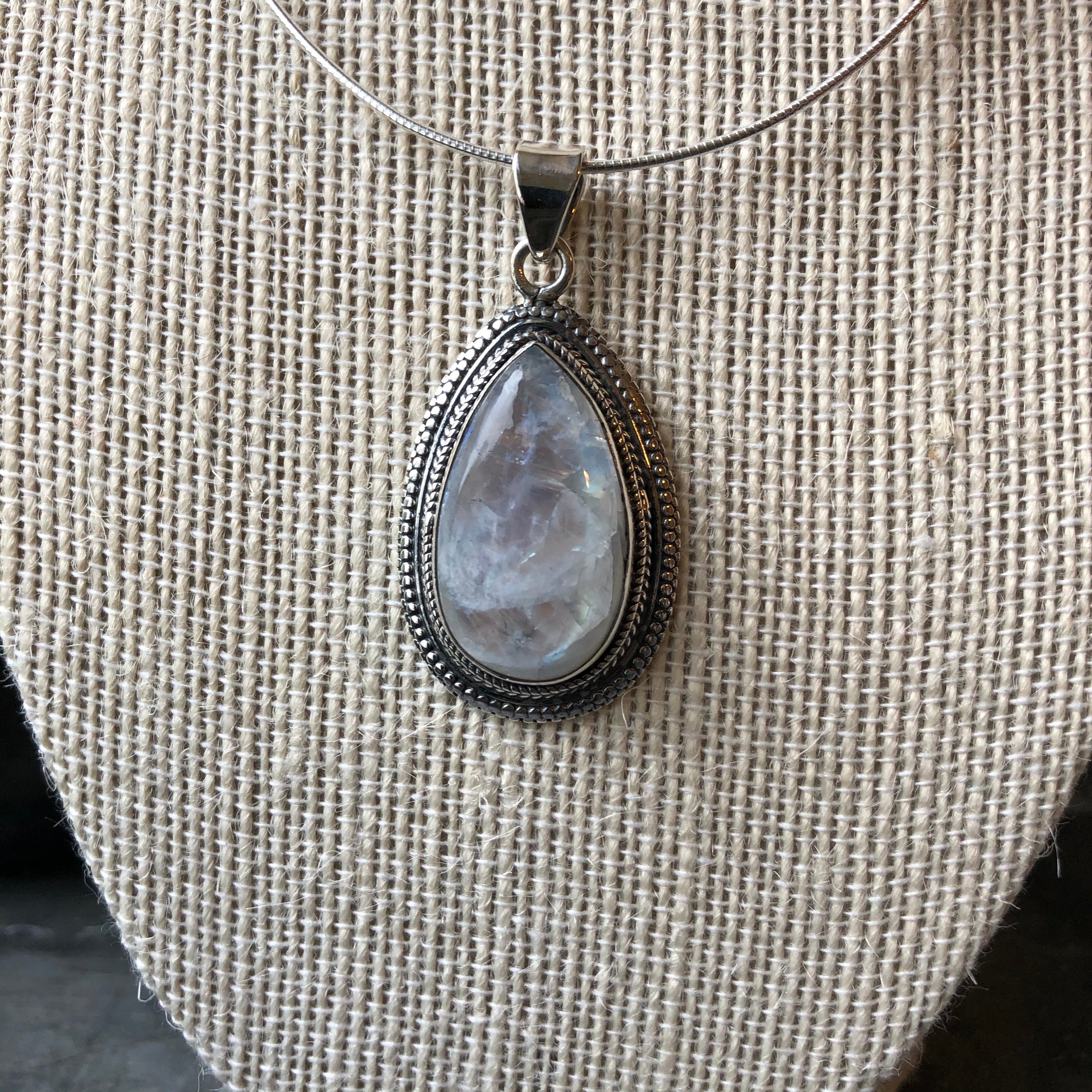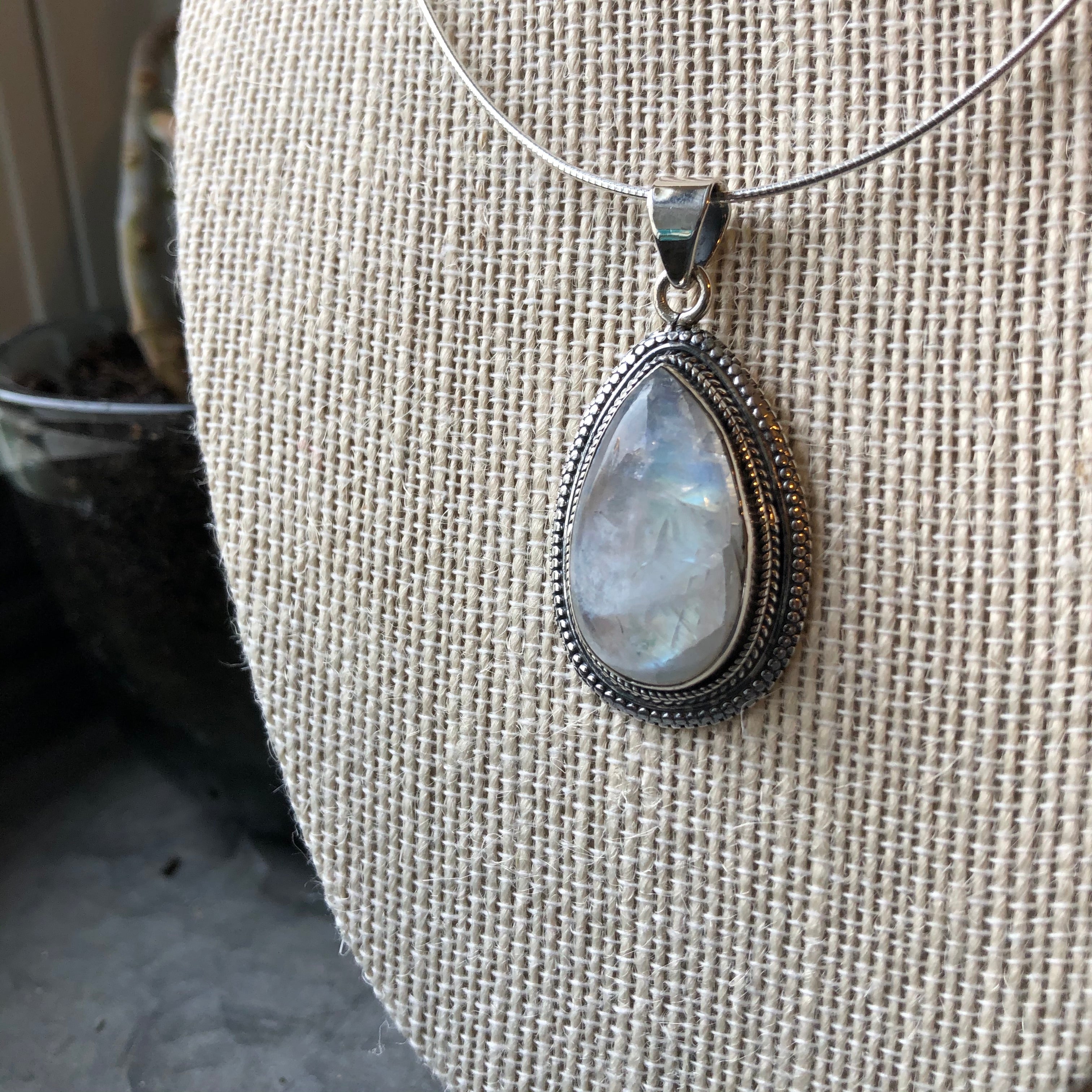 Gaze into the deepest depths of the vast sky with this absolutely stunning moonstone pendant necklace. Known for its metaphysical properties, moonstone soothes instability and calms a sea of emotions. This piece pairs well with a black mock neck top or your favorite black dress, when you're getting dolled up for that stay-at-home dinner reservation.