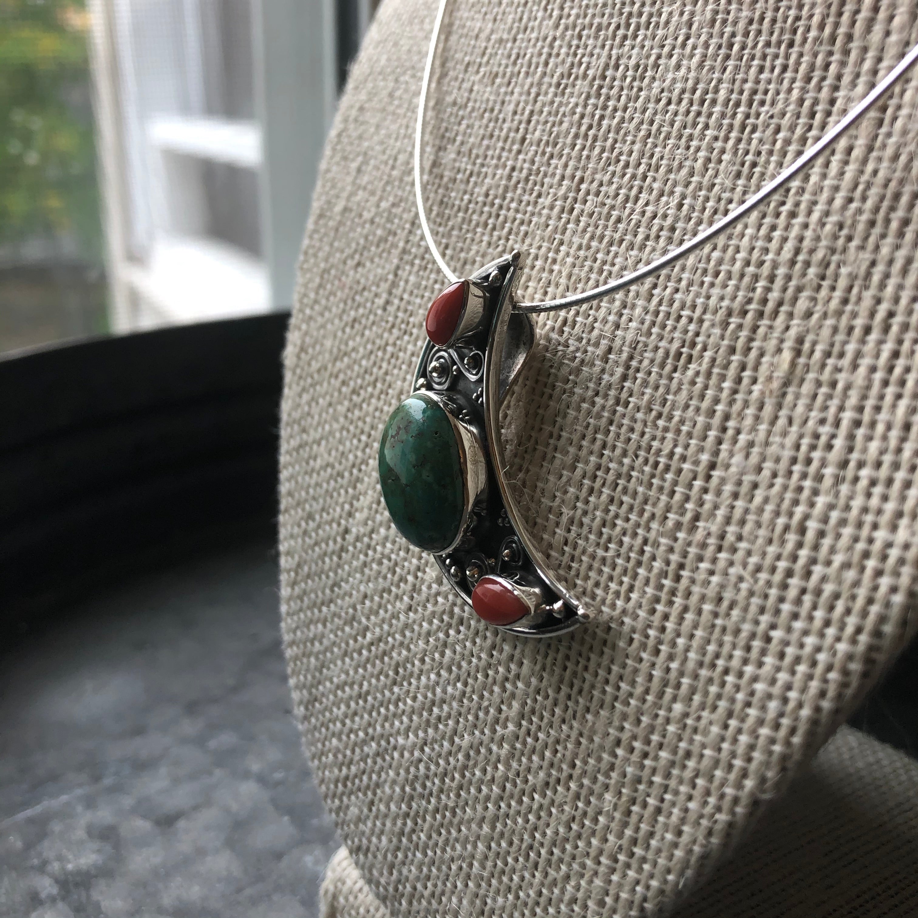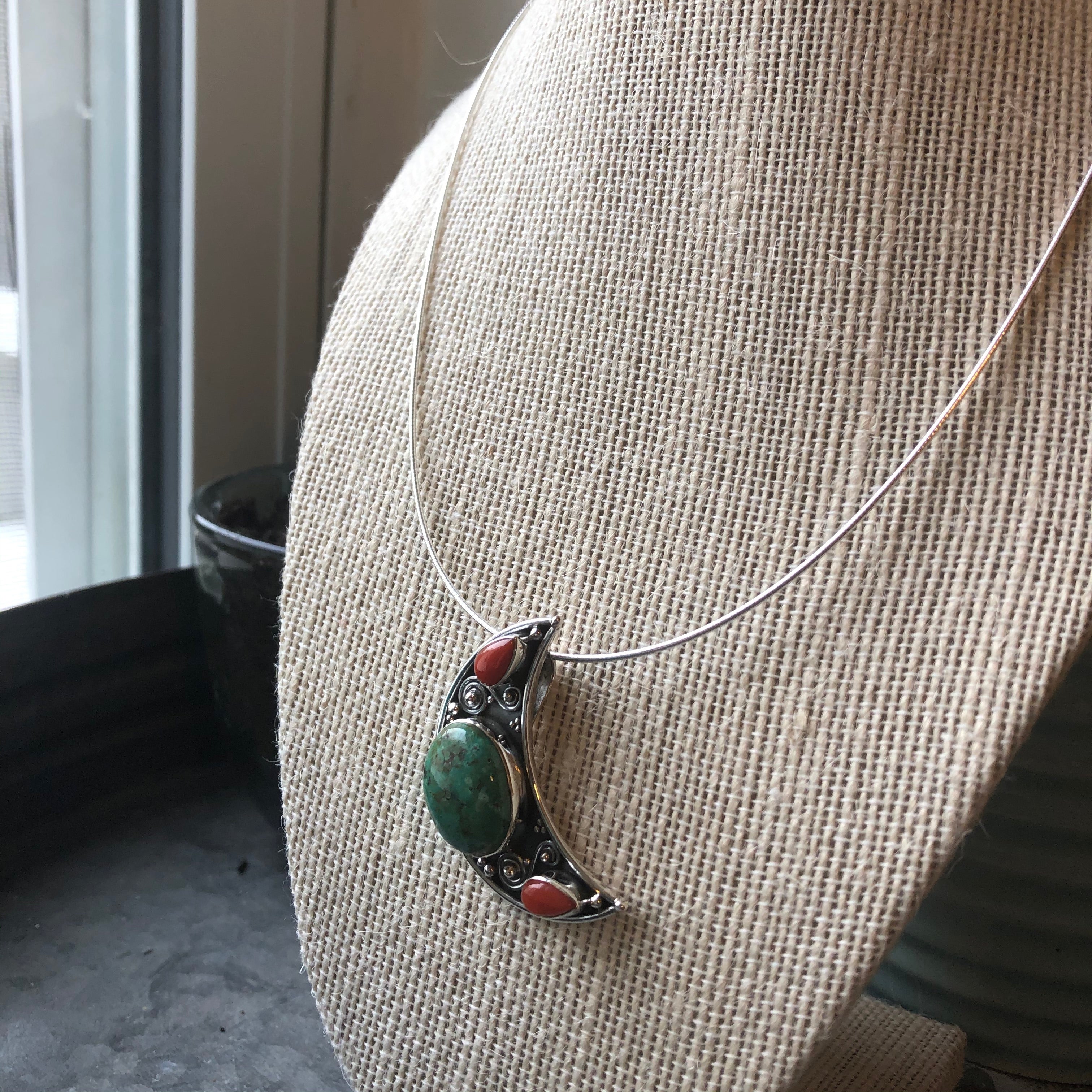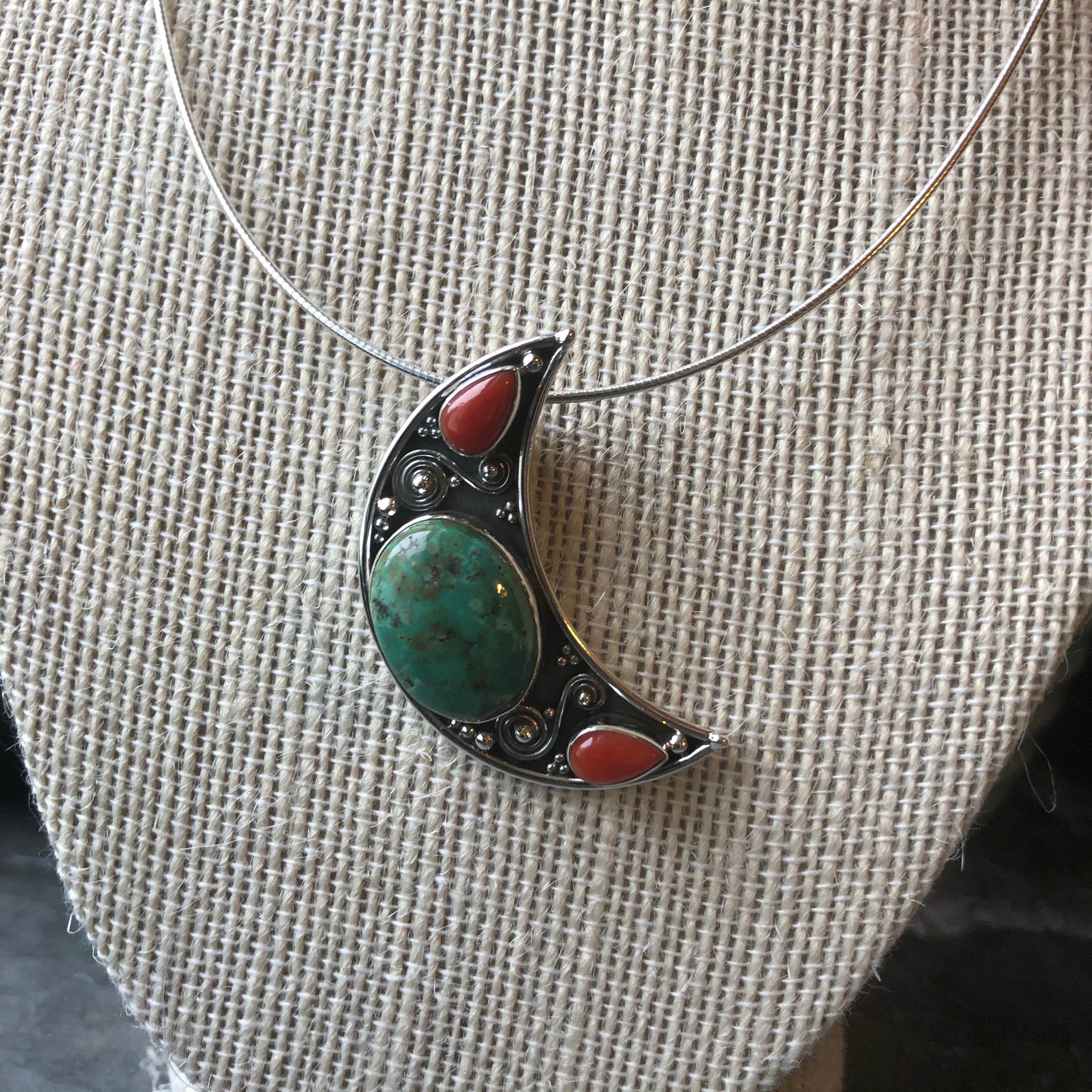 This piece is absolutely perfect for that fall feeling you want to bring in to your every day look. Beautifully fitted Turquoise paired with red accent stones and set in a gorgeous sterling silver moon ornament. This piece pairs well with a black turtleneck top, and just about every vintage piece in your collection.