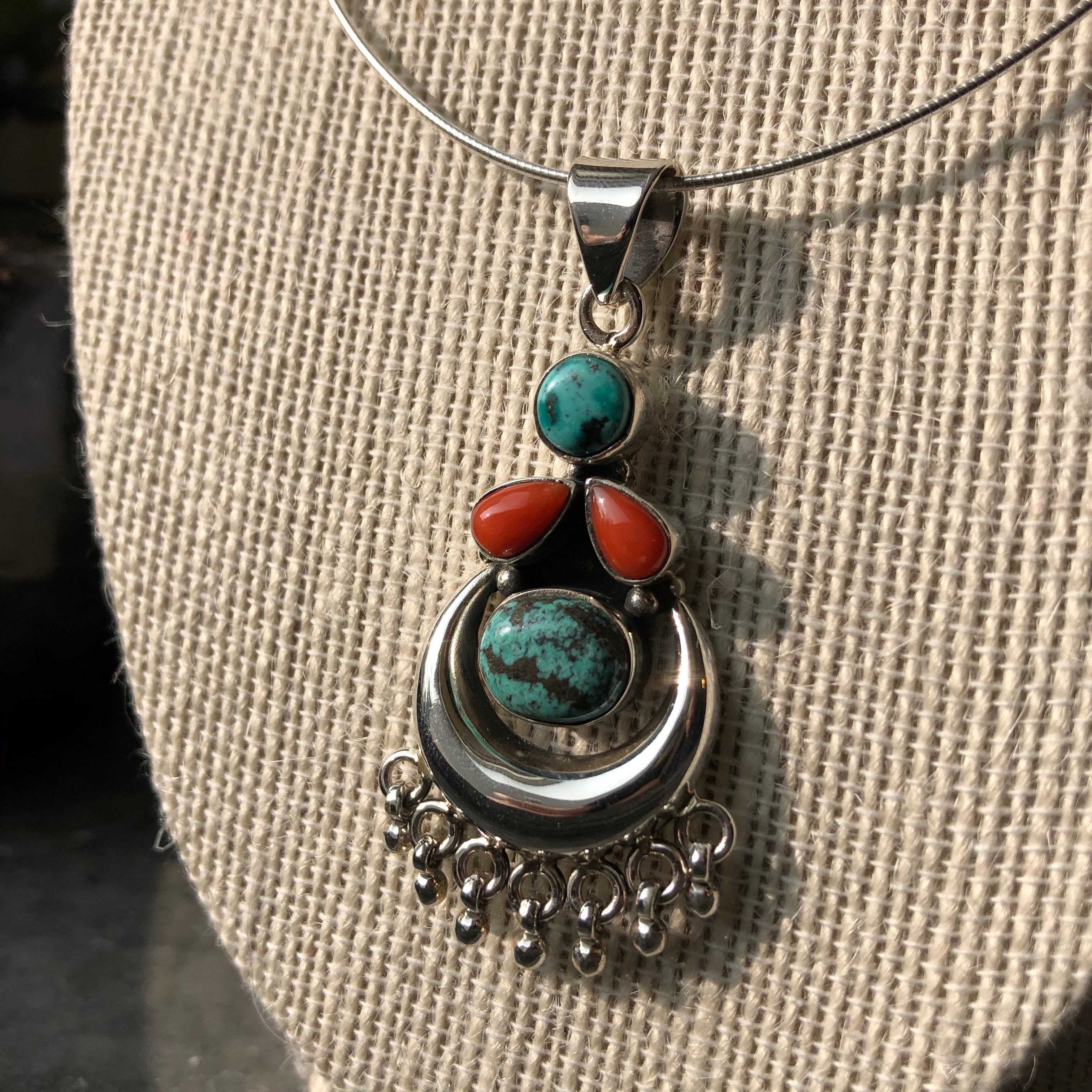 Gorgeous turquoise and red accent cabochons adorn this beautiful fall piece. Turquoise is known for its many healing metaphysical properties including protection against negative forces and energies. This piece is styled particularly well with any tailored white button down shirt, or your favorite fall jumpsuit.