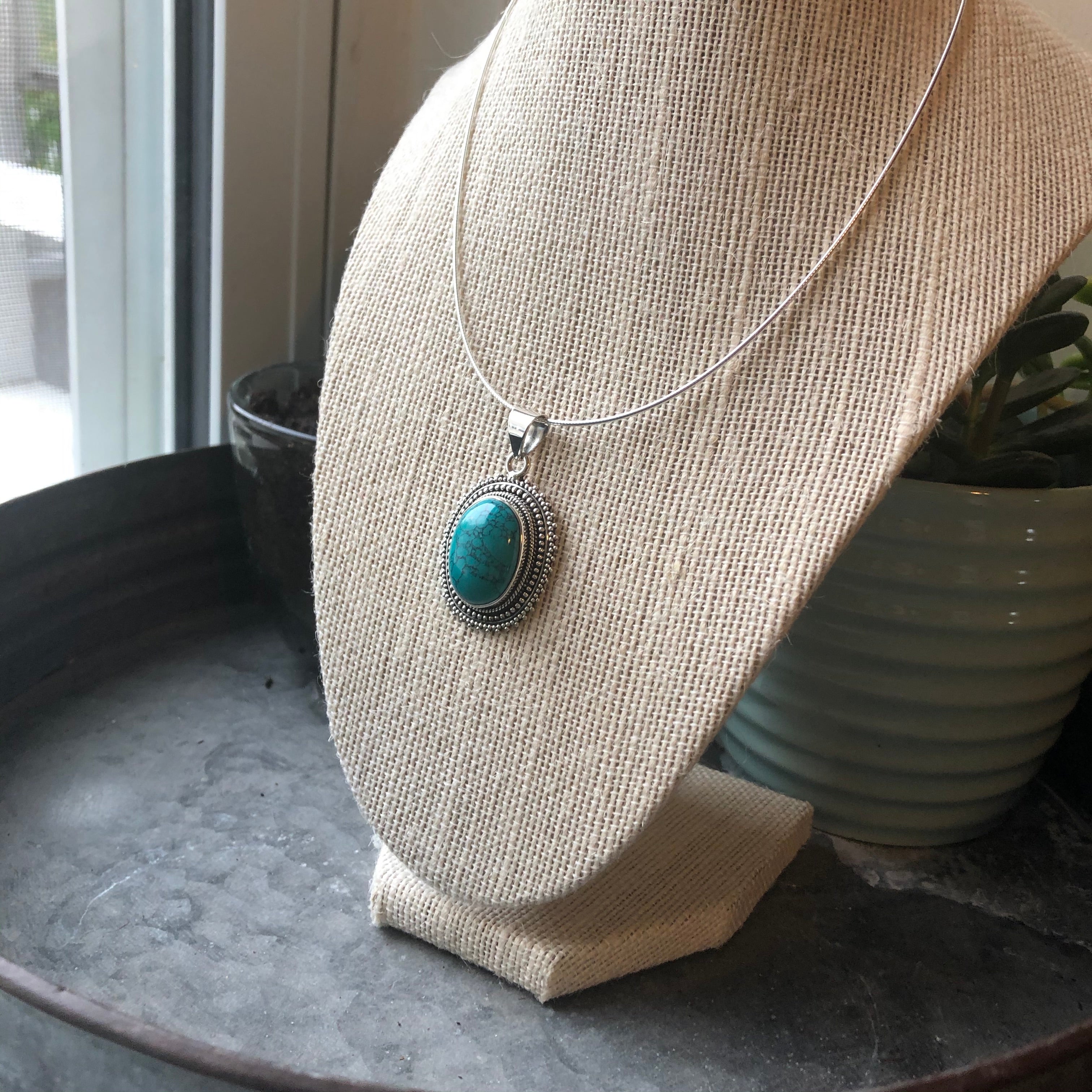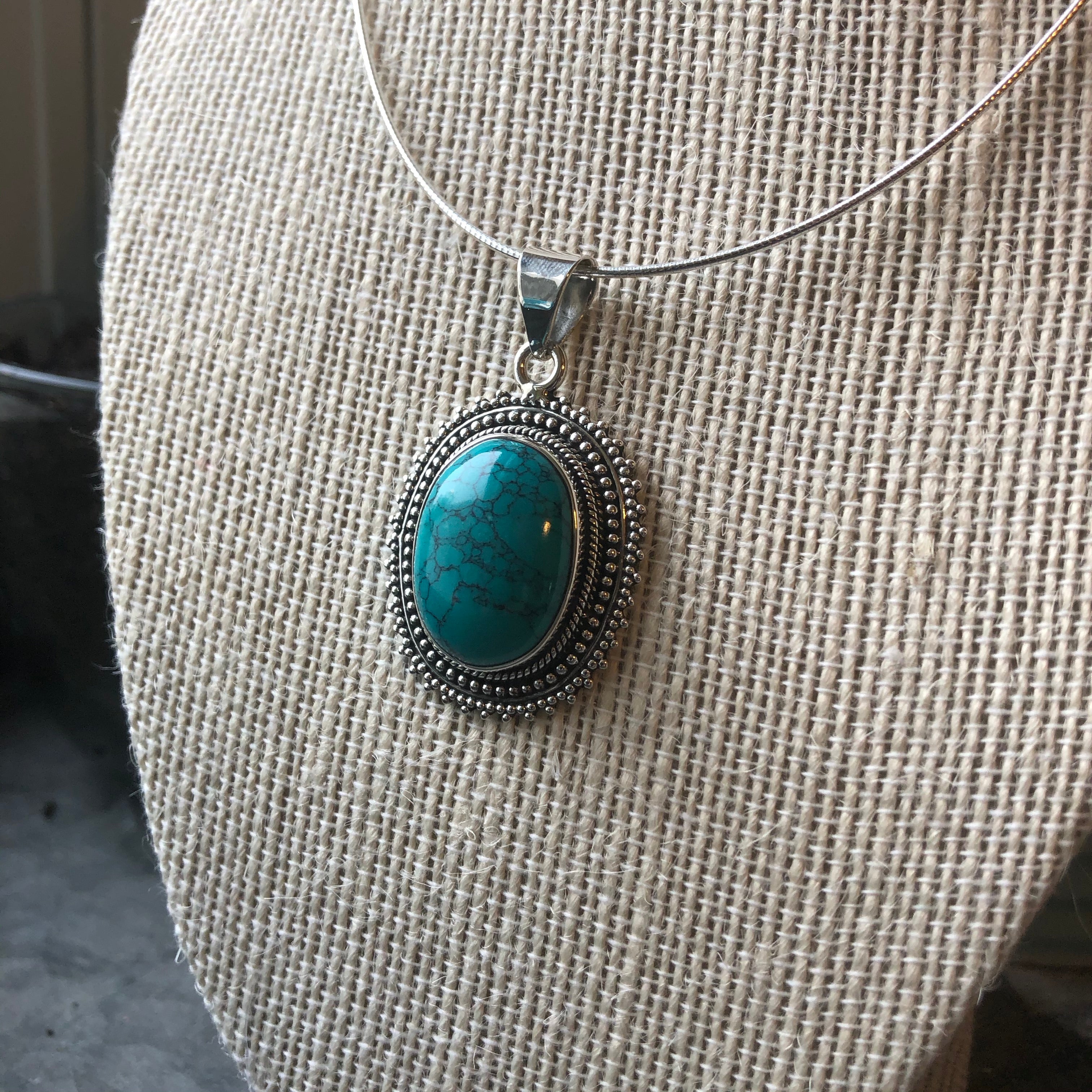 This beautiful Turquoise cabochon pendant is artfully set inside sterling silver ornamentation. Turquoise is a throat chakra stone, and is known for being a stone of clarity and heavenly communication.
